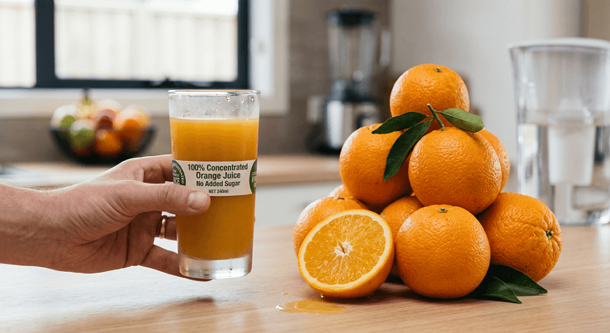 市售濃縮果汁的製作過程,通常是將新鮮果汁透過加熱或真空技術脫水,轉化為體積較小的濃縮液以利運輸,待裝瓶前再加入等比例的水分還原。雖然製程中可能沒有額外添加砂糖或高果糖糖漿,但水果本身的果糖與葡萄糖在脫水後會變得極其濃縮。